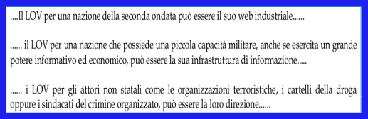 - Il secondo documento (Doc.2) contiene una analisi, quasi dettagliata, di pura ed alta strategia militare alla luce sia delle recenti ed attuali innovazioni tecnico/scientifiche che di quelle future o immediatamente future.Il tutto gravita attorno ad un obiettivo preciso: il nemico da colpire; questi viene inquadrato, nel documento, come: IL LOV ; “.....il LOV è ciò che l’avversario ha di più caro e che, se influenzato o minacciato, nuocerà alle capacità del nemico”.... il LOV può essere duro o morbido. Il LOV duro è rappresentato da: il militare, le armi di distruzione di massa, leindustrie – Il LOV morbido è rappresentato da: i sistemi, le conoscenze, i modi dipensare). Esempi :