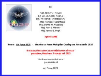"Bisognerebbe acquisire familiarità con il documento “Weather As a Force Multiplier: Owning the Weather in 2025”, un capitolo delle previsioni future. Le persone preoccupate circa le operazioni di aerosol in tutto il mondo nell’atmosfera e definite “scie chimiche”, spesso si riferiscono a questo testo come un’evidenza in grado di dimostrare che le forze armate statunitensi sono coinvolte nelle operazioni di irrorazione per il controllo del tempo."