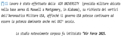 Nell’Agosto 1996 l’Aeronautica Militare USA ha presentato un corposo lavoro, molto interessante e diversificato, incentrato al 2025; due studi, di questo corposo lavoro, (*) sono: